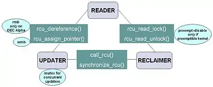 The implementation of RCU in version 2.6 of the Linux kernel is among the better-known RCU implementations and will be used as an inspiration for the RCU API in the remainder of this article. The core API (Application Programming Interface) is quite small:[21]
