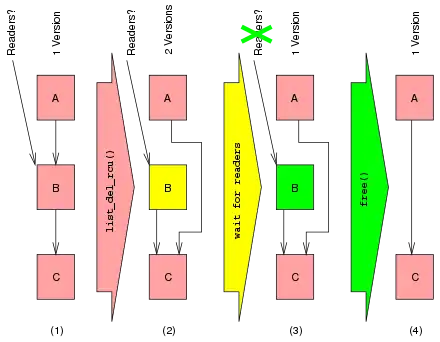 - sleep until the operating system kernel determines that there are no readers left using the old structure, for example, in the Linux kernel, by using synchronize_rcu(),