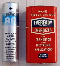 - ↑ "Eveready 412 Carbon Zinc 22.5V Battery NEDA 215, 15F20, BLR122". Batteriesinaflash.com.