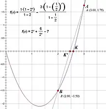 More precisely, suppose that in the k-th iteration the bracketing interval is (ak, bk). Construct the line through the points (ak, f (ak)) and (bk, f (bk)), as illustrated. This line is a secant or chord of the graph of the function f. In point-slope form, its equation is given by