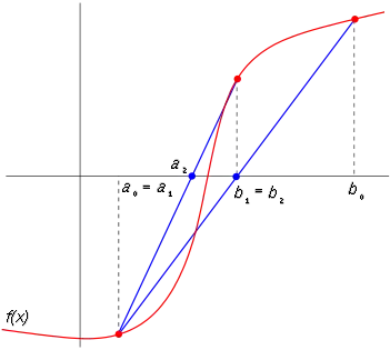 The regula falsi method calculates the new solution estimate as the x-intercept of the line segment joining the endpoints of the function on the current bracketing interval. Essentially, the root is being approximated by replacing the actual function by a line segment on the bracketing interval and then using the classical double false position formula on that line segment.[9]