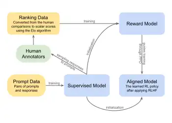 In RLHF, two different models are trained: a reward model and a reinforcement learning (RL) policy. The reward model learns to determine what behavior is desirable based on human feedback, while the policy is guided by the reward model to determine the agent's actions. Both models are commonly initialized using a pre-trained autoregressive language model. This model is then customarily trained in a supervised manner on a relatively small dataset of pairs of prompts to an assistant and their accompanying responses, written by human annotators. The reward model benefits from starting with a pre-trained model, as this initializes it with an understanding of language and focuses training explicitly on learning human preferences, speeding up the process. In addition to being used to initialize the reward model and the RL policy, the model is then also used to sample data to be compared by annotators.[13][12]