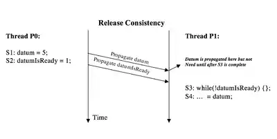 Consider the scenarios described in the image to the right. This case shows when write propagation is performed on a cache-coherent system based on the release consistency model. The variable datum is completely propagated before the propagation of datumIsReady. But the value of datum is not needed until after the acquire synchronization access in P1 and it can be propagated along with datumIsReady without harming the result of the program.