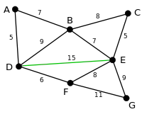The algorithm will start with the maximum weighted edge, which in this case is DE with an edge weight of 15. Since deleting edge DE does not further disconnect the graph, it is deleted. |