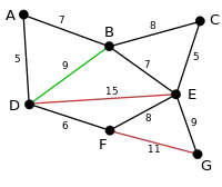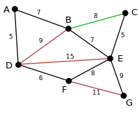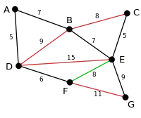 In the following example green edges are being evaluated by the algorithm and red edges have been deleted.