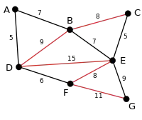This is our original graph. The numbers near the edges indicate their edge weight. |