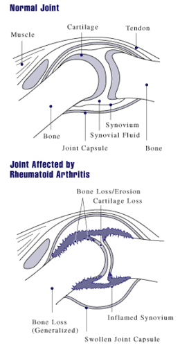 The clinical manifestations of disease are primarily inflammation of the synovial membrane and joint damage, and the fibroblast-like synoviocytes play a key role in these pathogenic processes.[17] Three phases of progression of RA are an initiation phase (due to non-specific inflammation), an amplification phase (due to T cell activation), and chronic inflammatory phase, with tissue injury resulting from the cytokines, IL–1, TNF-alpha, and IL–6.[20]