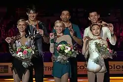 They attempted the throw triple Axel again in the short program at 2011 NHK Trophy but Savchenko took another hard fall.[42] They finished third at the event.[47] Savchenko/Szolkowy rebounded to win the 2011 Rostelecom Cup.[48] They qualified for the 2011–12 Grand Prix Final. Although they did not attempt it in Russia, they said they had not ruled out the triple Axel.[49] At the Grand Prix Final, Savchenko/Szolkowy won the gold medal with a total score of 212.26, defeating Volosozhar/Trankov by a margin of only 0.18 points.[50][51][52] Savchenko/Szolkowy missed their nationals with the German Skating Union's okay and continued to work on the throw triple Axel.[53]