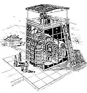 In 1066, the Chinese inventor Su Song built a water clock in the form of a tower which featured mechanical figurines which chimed the hours.[23][24][25] His mechanism had a programmable drum machine with pegs (cams) that bumped into little levers that operated percussion instruments. The drummer could be made to play different rhythms and different drum patterns by moving the pegs to different locations.[25]