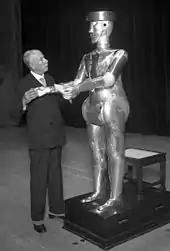 Westinghouse Electric Corporation built Televox in 1926; it was a cardboard cutout connected to various devices which users could turn on and off. In 1939, the humanoid robot known as Elektro was debuted at the 1939 New York World's Fair.[52][53] Seven feet tall (2.1 m) and weighing 265 pounds (120.2 kg), it could walk by voice command, speak about 700 words (using a 78-rpm record player), smoke cigarettes, blow up balloons, and move its head and arms. The body consisted of a steel gear, cam and motor skeleton covered by an aluminum skin. In 1928, Japan's first robot, Gakutensoku, was designed and constructed by biologist Makoto Nishimura.