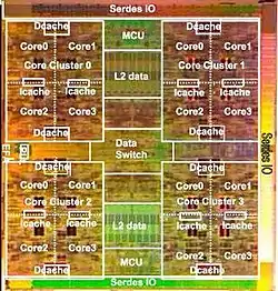 The 16 cores in Rock are arranged in four core clusters. The cores in a cluster share a 32 KB instruction cache, two 32 KB data caches, and two floating point units. Sun designed the chip this way because server workloads usually have high re-utilization in data and instruction across processes and threads but low number of floating-point operations in general. Thus sharing hardware resources among the four cores in a cluster leads to significant savings in area and power but low impact to performance.[4]