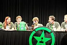 One of the non-gameplay videos that the drunkgamers crew created during this time was a live-action parody of the Apple Switch ad campaign. This video featured Sorola as the main actor, used Peter Tchaikovsky's "Dance of the Sugar Plum Fairy" as background music, and focused on the lack of games available for the Apple Macintosh computer.[14] Sorola and Burns said that the name was changed from 'Drunk Tank Podcast' to 'Rooster Teeth Podcast' for the same reason that 'Drunk Gamers' was changed to 'Rooster Teeth': Nobody would give games or sponsor something with 'drunk' in the title "because it was so unprofessional."[15] Burns said of the name change, "We named it something else to give people the idea that we were going to be doing more than that".[16] The name "Rooster Teeth" is a euphemism for "cockbite", an insult from the original Red vs. Blue trailer that Burns described as a "touchstone for the audience".[17][18]