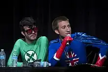Rooster Teeth first ventured into live action in 2009 with Captain Dynamic, a mini-series to promote the online game City of Heroes.[88] The series tells the story of a team of writers hired to use the new in-game content creation tools to promote the title character, Captain Dynamic, the 'worst superhero in the world'. Directed by Matt Hullum and written by Burnie Burns, the series starred Ed Robertson of the Barenaked Ladies, who is a long time friend and fan of Rooster Teeth. A number of Rooster Teeth employees were present throughout the series, notably Joel Heyman as Captain Dynamic's primary writer. Actor Shannon McCormick appears as the series' antagonist, Great Face.[89] The series also led to the release of an iPhone app called the Awesome Button.[90]