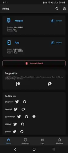 - Ability to install software (such as Xposed, Magisk, SuperSU, BusyBox, etc.) that allows additional levels of control on a rooted device or management of root access.