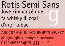 - Rotis semi-sans (semi-grotesque) — with zero serifs but with stroke width variation