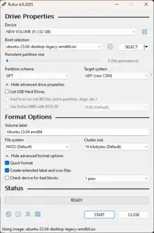 Rufus (The Reliable USB Formatting Utility, with Source[4]) is a free and open-source portable application for Microsoft Windows that can be used to format and create bootable USB flash drives or Live USBs.