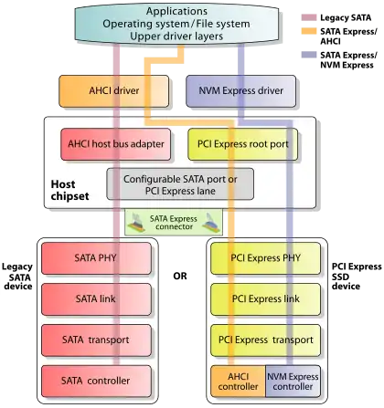 - Used for backward compatibility with legacy SATA devices, and interfaced through the AHCI driver and legacy SATA 3.0 (6 Gbit/s) ports provided by a SATA Express controller.