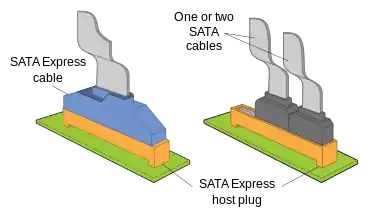 SATA Express (sometimes unofficially shortened to SATAe) is a computer bus interface that supports both Serial ATA (SATA) and PCI Express (PCIe) storage devices, initially standardized in the SATA 3.2 specification.[1] The SATA Express connector used on the host side is backward compatible with the standard SATA data connector,[2] while it also provides two PCI Express lanes as a pure PCI Express connection to the storage device.[3]