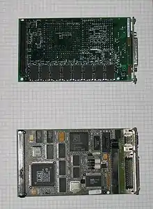 SBus cards had a very compact form factor for the time. A single-width card was 83.82 millimetres (3.300 in) wide by 146.7 millimetres (5.78 in) long and is designed to be mounted parallel to the motherboard. This allowed for three expansion slots in the slim "pizza box" enclosure of the SPARCstation 1.[4] The design also allows for double- or triple-width cards that take up two or three slots, as well as double-height (two 3x5 inch boards mounted in a "sandwich" configuration) cards.