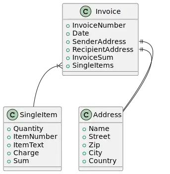 INVOICE │ ├─ INVOICE_NO ├─ DATE ├─ ADDRESS_SENDER │ ├─ NAME │ ├─ NAME │ ├─ STREET │ ├─ ZIP │ ├─ CITY │ └─ COUNTRY ├─ ADDRESS_RECIPIENT │ ├─ NAME │ ├─ NAME │ ├─ STREET │ ├─ ZIP │ ├─ CITY │ └─ COUNTRY ├─ INVOICE_SUM ├─ SINGLE_ITEMS │ ├─ SINGLE_ITEM │ │ ├─ QUANTITY │ │ ├─ ITEM_NUMBER │ │ ├─ ITEM_TEXT │ │ ├─ CHARGE │ │ └─ SUM │ └─ ... ├─ CONDITIONS ...