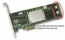![]() Typical host bus adapter with two 4× iPass connectors |