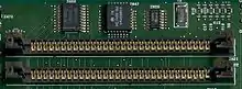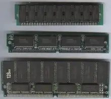 A SIMM (single in-line memory module) is a type of memory module used in computers from the early 1980s to the early 2000s. It is a printed circuit board on which has random-access memory attached to one or both sides.[1] It differs from a dual in-line memory module (DIMM), the most predominant form of memory module since the late 1990s, in that the contacts on a SIMM are redundant on both sides of the module. SIMMs were standardised under the JEDEC JESD-21C standard.