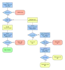 STUN was first announced in RFC 3489.[1] The original specification specified an algorithm to characterize NAT behavior according to the address and port mapping behavior. This algorithm is not reliably successful and only applicable to a subset of NAT devices deployed. The algorithm consists of a series of tests to be performed by an application. When the path through the diagram ends in a red box, UDP communication is not possible and when the path ends in a yellow or green box, communication is possible. The methods of RFC 3489 proved too unreliable to cope with the plethora of different NAT implementations and application scenarios encountered in production networks. The STUN protocol and method were updated in RFC 5389, retaining many of the original specifications as a subset of methods, but removing others.