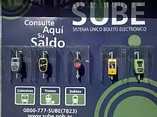 The Sistema Único de Boleto Electrónico (Unique Electronic Ticket System, mostly known for its acronym SUBE) is a contactless smart card system introduced in Argentina in February 2009. It is used on public transport services within the Buenos Aires metropolitan area and other Argentine cities and was promoted by the Argentine Secretary of Transportation. It is valid on a number of different travel systems across the city including the Underground, buses and trains.