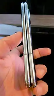 The Galaxy Fold contains two displays; its front cover contains a small, 4.6-inch display in the center designed for one-handed use, and the device can fold open to expose a 7.3-inch display. Samsung rated the fold mechanism as supporting up to 200,000 uses. The tablet screen contains a large notch in the top-right corner, and is coated with a custom multi-layer laminate in lieu of glass.[24] Its power button contains a fingerprint reader.
