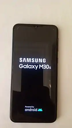 The Samsung Galaxy M30s is an Android phone manufactured by Samsung Electronics as part of its first-generation Galaxy M series lineup, as a successor to the Samsung Galaxy M30. The phone is shipped with Android 9 (Pie), Samsung's proprietary One UI skin, 64 or 128 GB of internal storage, and a 6000 mAh Li-Po battery. The M30s was released on 18 September 2019.[5][6] It features a rear triple camera array composing of a 48 MP wide angle camera, 8 MP ultra wide angle camera, and a 5 MP depth sensor.[7][8]