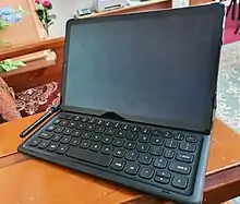 A detachable keyboard accessory is also offered separately and magnetically latches onto the Tab S4.[24] It has a holster for the S Pen but does not include a touchpad, requiring users to rely on the touchscreen, S Pen or a bluetooth mouse for input.[25]