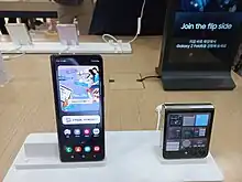 The Samsung Galaxy Z Flip and Z Flip 5G were released on 14 February 2020 and 7 August 2020 respectively, and was the first device to be marketed under the "Z" brand.[1] Unlike the Galaxy Fold, the device folds vertically and uses a hybrid glass coating branded as "Infinity Flex Display".[6][7][8]