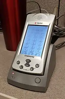 The Samsung SPH-i300 was an early Palm OS-based PDA and smartphone manufactured by Samsung, released around August 2001 and marketed in the United States for use on Sprint's mobile phone network.[2] It was the first "PDA phone" (as devices that combined phone and PDA functions were then called) in the US with a color screen.