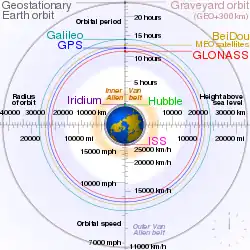Global coverage for each system is generally achieved by a satellite constellation of 18–30 medium Earth orbit (MEO) satellites spread between several orbital planes. The actual systems vary, but all use orbital inclinations of >50° and orbital periods of roughly twelve hours (at an altitude of about 20,000 kilometres or 12,000 miles).