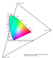 ![]() Intersection of the scRGB gamut with the X+Y+Z=.6443 plane (the gamut varies depending on the intensity as it is a cube with a non-zero origin). | |