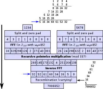 By using FFT (fast Fourier transform), used in original version rather than NTT,[7] with convolution rule; we get
