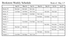An example of an internal schedule is a workplace schedule, which lists the hours that specific employees are expected to be in a workplace, ensure sufficient staffing at all times while in some instances avoiding overstaffing. A work schedule for a business that is open to the public must correspond to the hours of operation of the business, so that employees are available at times when customers are able to use the services of the business. One common method of scheduling employees to ensure the availability of appropriate resources is a Gantt chart. Another example of an internal schedule is the class schedule of an individual student, indicating what days and times their classes will be held.
