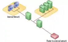 In network security a screened subnet refers to the use of one or more logical screening routers as a firewall to define three separate subnets: an external router (sometimes called an access router), that separates the external network from a perimeter network, and an internal router (sometimes called a choke router) that separates the perimeter network from the internal network. The perimeter network, also called a border network or demilitarized zone (DMZ), is intended for hosting servers (sometimes called bastion hosts) that are accessible from or have access to both the internal and external networks.[1][2][3] The purpose of a screened subnet or DMZ is to establish a network with heightened security that is situated between an external and presumed hostile network, such as the Internet or an extranet, and an internal network.