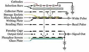 Reading was accomplished by scanning the reading gun across the storage area. This gun was set to a voltage that would cross the secondary emission threshold for the entire display. If the scanned area held the holding gun potential a certain number of electrons would be released, if it held the writing gun potential the number would be higher. The electrons were read on a grid of fine wires placed behind the display, making the system entirely self-contained. In contrast, the Williams tube's read plate was in front of the tube, and required continual mechanical adjustment to work properly.[6] The grid also had the advantage of breaking the display into individual spots without requiring the tight focus of the Williams system.