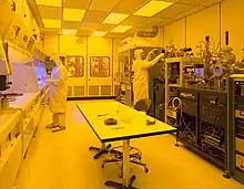 The fabrication process is performed in highly specialized semiconductor fabrication plants, also called foundries or "fabs",[1] with the central part being the "clean room". In more advanced semiconductor devices, such as modern 14/10/7 nm nodes, fabrication can take up to 15 weeks, with 11–13 weeks being the industry average.[2] Production in advanced fabrication facilities is completely automated, with automated material handling systems taking care of the transport of wafers from machine to machine.[3]