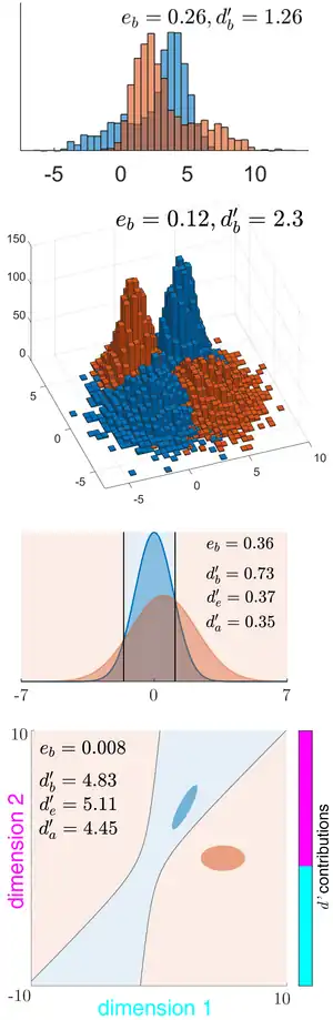 Thus, and underestimate the maximum discriminability of univariate normal distributions. can underestimate by a maximum of approximately 30%. At the limit of high discriminability for univariate normal distributions, converges to . These results often hold true in higher dimensions, but not always.[1] Simpson and Fitter [3] promoted as the best index, particularly for two-interval tasks, but Das and Geisler [1] have shown that is the optimal discriminability in all cases, and is often a better closed-form approximation than , even for two-interval tasks.