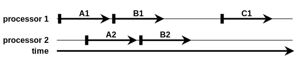 execution order between A1, B1 and C1 is preserved, that is, A1 runs before B1, and B1 before C1. The same for A2 and B2. But, as execution order between processors is undefined, B2 might run before or after C1 (B2 might physically run before C1, but the effect of B2 might be seen after that of C1, which is the same as "B2 run after C1")