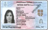 Serbian identity card (Serbian: Лична карта, romanized: Lična karta) is the national identification card used in Serbia. The document is issued by the Serbian Police on behalf of the Ministry of Internal Affairs and is the main form of identification on the territory of the Republic of Serbia. Although it can be issued to citizens above 10 years of age, all Serbian citizens over the age of 16 are legally obliged to carry their identity cards with them at all times and are subject to fines should they not. The identity card is a primary photo ID, Serbian passport and drivers license are used as valid photo IDs for various purposes.[1]