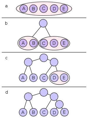 With this division, A and B will each have a code that starts with a 0 bit, and the C, D, and E codes will all start with a 1, as shown in Figure b. Subsequently, the left half of the tree gets a new division between A and B, which puts A on a leaf with code 00 and B on a leaf with code 01.