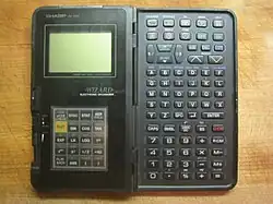 The later Sharp Wizards were something between an electronic databank and a PDA. They were small, lightweight devices with keyboards but no touch screen, running on a Zilog Z80.