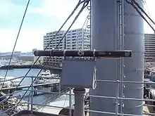 The function of the Mark 37 Director, which resembles a gun mount with "ears" rather than guns, was to track the present position of the target in bearing, elevation, and range. To do this, it had optical sights (the rectangular windows or hatches on the front), an optical rangefinder (the tubes or ears sticking out each side), and later models, fire control radar antennas. The rectangular antenna is for the Mark 12 FC radar, and the parabolic antenna on the left ("orange peel") is for the Mark 22 FC radar. They were part of an upgrade to improve tracking of aircraft.