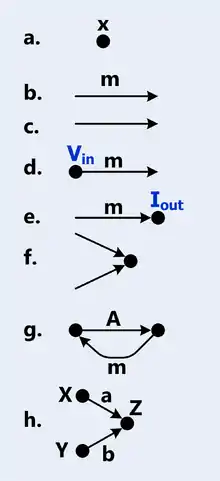 - Exhibit (a) is a node. In this case, the node is labeled . A node is a vertex representing a variable or signal.