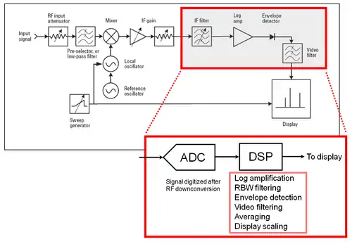 Modern signal analyzers use a superheterodyne receiver to downconvert a portion of the signal spectrum for analysis. As shown in the figure to the right, the signal is first converted to an intermediate frequency and then filtered in order to band-limit the signal and prevent aliasing. The downconversion can operate in a swept-tuned mode similar to a traditional spectrum analyzer, or in a fixed-tuned mode. In the fixed-tuned mode the range of frequencies downconverted does not change and the downconverter output is then digitized for further analysis. The digitizing process typically involves in-phase/quadrature (I/Q) or complex sampling so that all characteristics of the signal are preserved, as opposed to the magnitude-only processing of a spectrum analyzer. The sampling rate of the digitizing process may be varied in relation to the frequency span under consideration or (more typically) the signal may be digitally resampled.