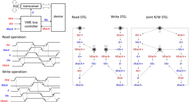 STGs were first proposed in 1981, under the name Signal Graphs, by Leonid Rosenblum (in Russian) in.[2] They were studied more formally and applied to the design of asynchronous interfaces by Alex Yakovlev in 1982, in his PhD thesis [3] (in Russian). They were later presented in English in 1985, in two independent sources, one by Rosenblum and Yakovlev in[4] and the other by Tam-Anh Chu in [5] (an earlier version was presented at ICCD'85). Since then, STGs have been studied extensively in theory and practice,[6][7][8][9][10][11][12] which has led to the development of popular software tools for analysis and synthesis of asynchronous control circuits, such as Petrify[13] (chief developer: Jordi Cortadella) and Workcraft (a toolkit from Newcastle University).[14]