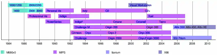 SGI produced a broad range of MIPS-based workstations and servers during the 1990s, running SGI's version of UNIX System V, now called IRIX. These included the massive Onyx visualization systems, the size of refrigerators and capable of supporting up to 64 processors while managing up to three streams of high resolution, fully realized 3D graphics.